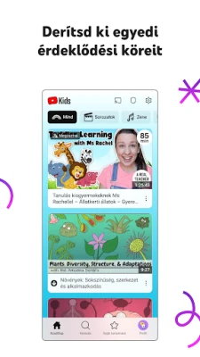Minden gyermek egyedi, és a YouTube Kids ezt tiszteletben tartja. Hagyja, hogy gyermekei az életkoruknak és érdeklődési körüknek megfelelő tartalmakon keresztül fedezzék fel a világot, a kezdeti ábécé tanulástól a bonyolultabb barkácsolásokig. Az alkalmazásban kialakított módok – az óvodásoknak szánt felfedező utak, a fiatalabb korosztályt megcélzó zenei és történetmesélő kalandok, vagy az idősebbek számára készült, népszerű témák – mind a személyre szabott élményt szolgálják. Sőt, a szülők akár saját kezűleg is válogathatnak össze videókat és csatornákat, így garantálva, hogy csak a jóváhagyott, minőségi tartalom jusson el a gyermekekhez.